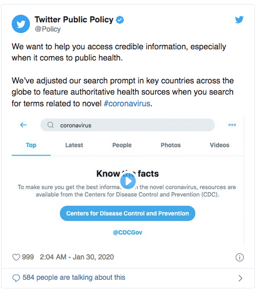 Some Big Tech companies are already fighting the misinformation surrounding the Coronavirus. Facebook will remove misinformation about the Coronavirus from its platform, Google is displaying information from the WHO in search results, and Twitter has changed its search prompt to grab information from “authoritative health sources” to the top of the page. While this is a promising start, individuals must take action as well to reduce the spread of misinformation.